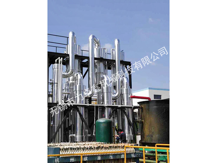工作原理:四效降膜蒸發(fā)器需濃縮的料液由泵送入加熱管頂部,沿著加熱管內(nèi)壁形成液膜向下流動。在這個過程中,由于管外的加熱,管內(nèi)液膜開始沸騰并部分蒸發(fā)